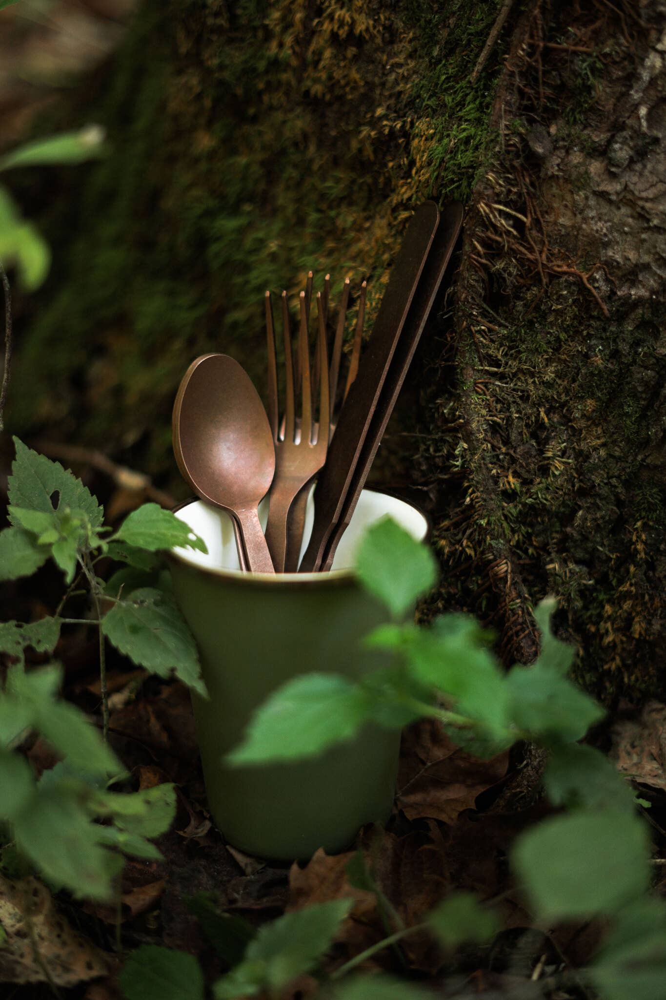 The white speckled interior resists stains, while the matte olive drab exterior offers a textured grip and a bronze-tone stainless steel rim for a clean, utilitarian look.